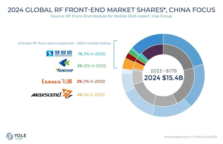 中國射頻廠商同樣活躍,正加快減少對海外的依賴,卓勝微(Maxscend)、唯捷創(chuàng)芯(Vanchip)、昂瑞微(OnMicro)、智聯(lián)微(SmarterMicro)等領(lǐng)軍企業(yè)表現(xiàn)突出。海思(HiSilicon)也確認(rèn)回歸,推出自研射頻前端與SoC方案。