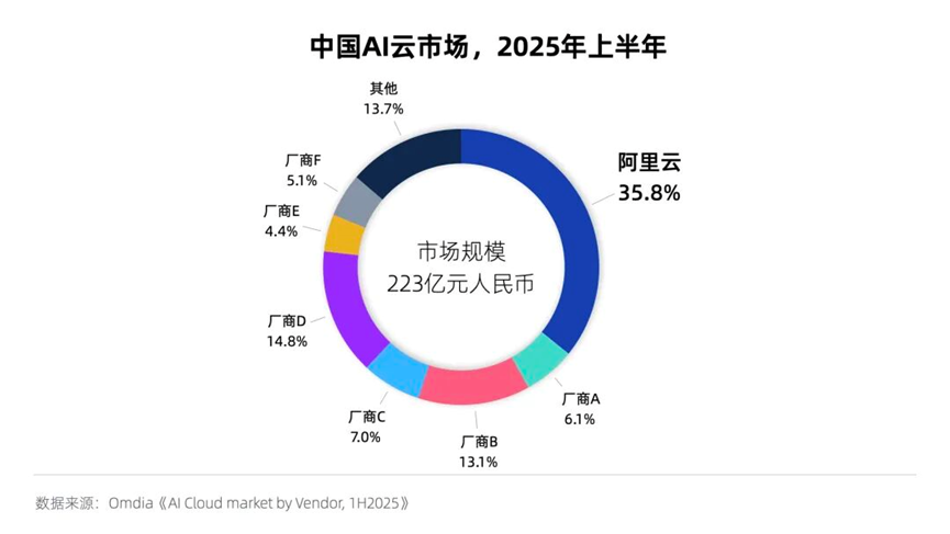 2025年上半年,中國AI云市場規(guī)模達(dá)223億元,阿里云占比35.8%位列第一,市場份額高于2到4名的總和,憑“AI全棧”繼續(xù)引領(lǐng)市場發(fā)展。