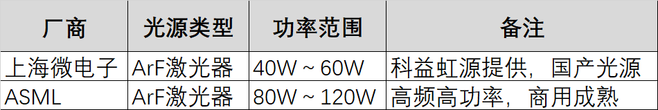 根據(jù)搜索結(jié)果,目前上海微電子(SMEE)已交付的28nm光刻機(jī)采用的是40W~60W的ArF準(zhǔn)分子激光光源系統(tǒng),其光源由科益虹源提供,重頻為6KHz,輸出穩(wěn)定性達(dá)99.99%,壽命超過3萬小時(shí)。